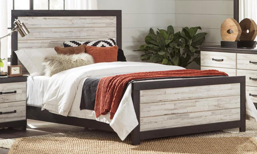 272 Destin bedroom group in a two toned cottage white finish with bed framing in a matte black finish. Fully assembled case pieces come in a two to...