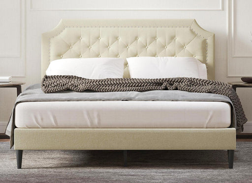 The sculpted shape draws the eye, while the button tufting keeps it soft and linen upholstery is edged with an accent row of pewter nail-head trim....